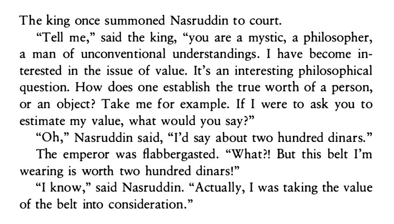Shown below is a Medieval Turkish story about the concept of value (from David Graeber’s book Debt: The First 5,000 Years). Nasruddin (or Nasreddin) was, according to Wikipedia, a 13th century “satirical Sufi figure” and “a populist philosopher and wise man, remembered for his funny stories and anecdotes.”