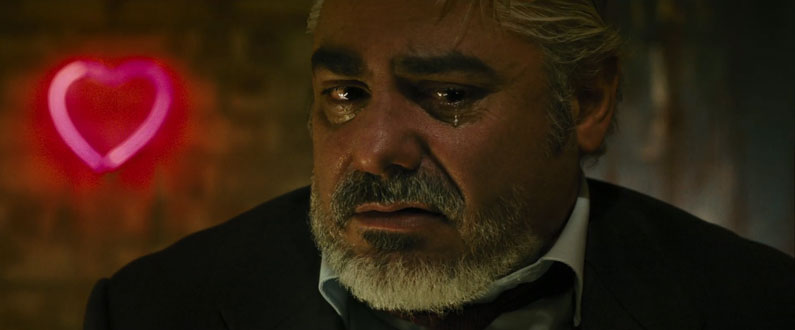 In the most macabre moment of the film, James is ushered in to meet his ultimate fate, to be consumed by The Porpoise, a fat man who sits at a table cutting through something dark and bloody on a white plate, his mouth contorted by the etched lines of voracious consumption. As the clown had told James moments earlier, “You’re a consumer. It’s only fair that you get consumed.” There is screaming. The Porpoise anticipates his imminent meal with relish. James pleads for his “life.”2