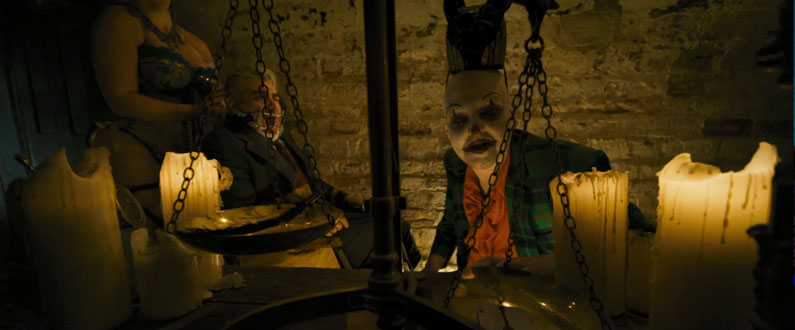 The clown proceeds through a funerary rite from the Egyptian Book of the Dead, measuring Mitchum’s heart (in the form of a Ace of hearts with a trickle of blood at its centre) against that of the feather of silence and truth, “the plume of Maat.” If the weight of his sins exceed that of purity, measured by the feather, he has failed. The clown, an open book in his hand, confronts James about his sins. In life, has he “extinguished the fire at its critical moment,” blotting out goodness in favour of the darkest impulses of the human heart? If so, the weight of his sins may tip heavy on the scales of justice. Inevitably, they do. He fails. He must be punished.